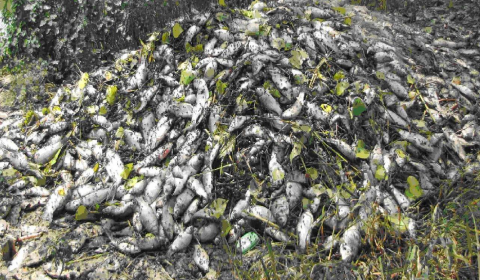 异育银鲫造血器官坏死症原本只是在江苏省盐城地区流行的一种恶性传染病,现在已经在全国养殖异育银鲫的地方均有发生了。对各地异育银鲫养殖业每年均有不同程度地流行与危害。该病一旦发生,造成的死亡率一般为30.0%~40.0%,严重时可达90.0%以上。如果养殖业者在疾病发生期间,采用错误的处理方法(如采取“致病先杀虫”的方法等)即可加速患病鱼体的死亡,甚至导致整个池塘中异育银鲫全部死亡的事例也是时有发生(图3)。