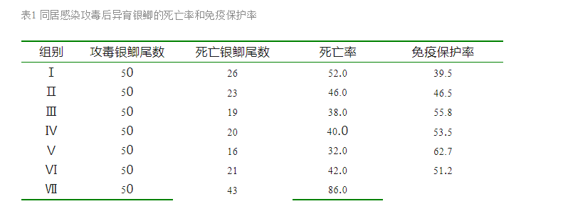 根据上述网箱内试验获得的结果,选择酵母免疫多糖作为预防养殖鱼类病毒病的免疫调节剂,添加在养殖鱼类饲料中制备成所谓“免疫饲料”。根据养殖鱼类病毒性疾病发生的时间,提前投喂养殖异育银鲫和鲤,预防养殖异育银鲫的造血器官坏死症和养殖鲤的鲤疱疹病毒病。结果证明,连续投喂免疫饲料28d,可以有效地预防病毒性疾病的发生。