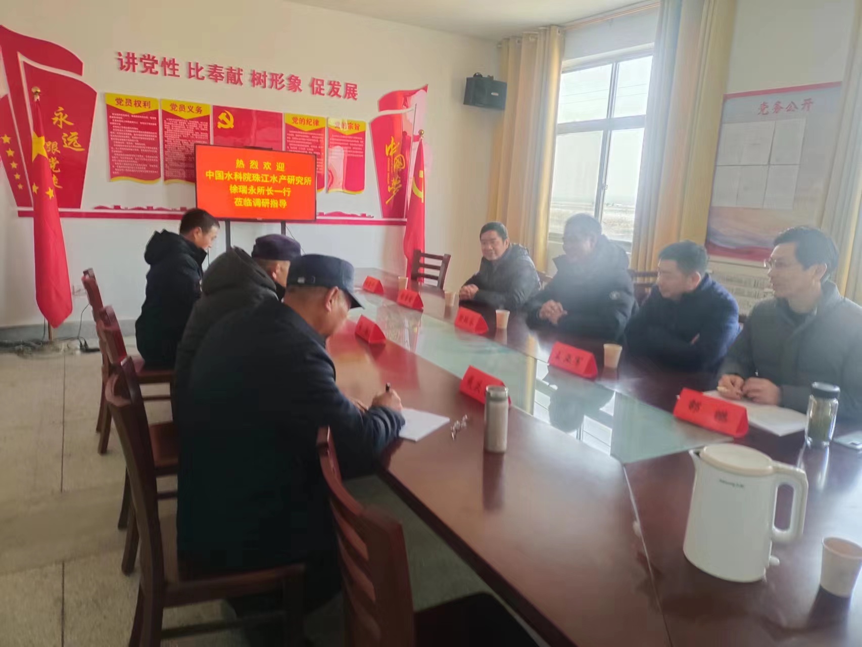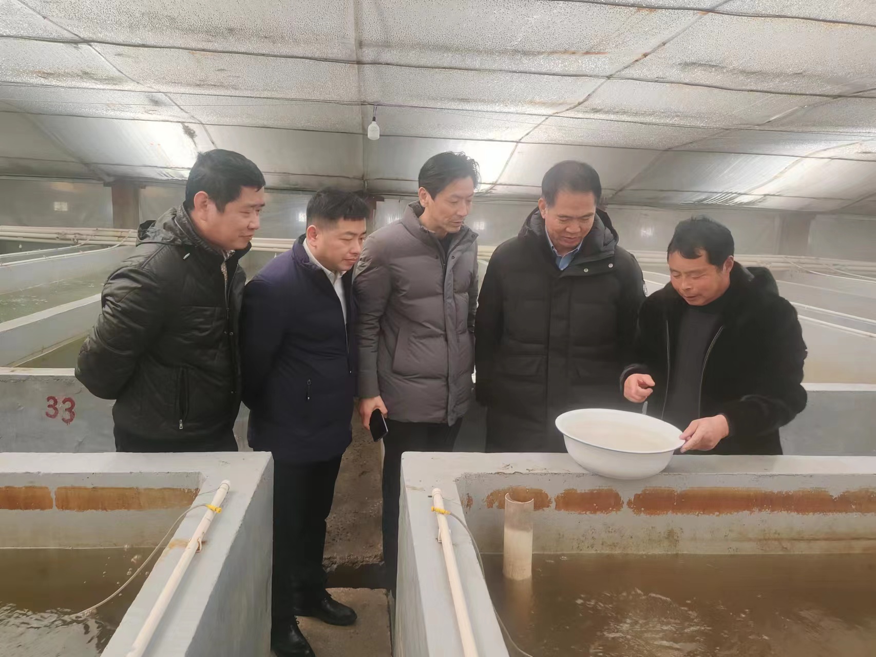 2023年12月24日上午,中国水产科学研究院珠江水产研究院徐瑞永所长、成果转化处处长王亚军、珠江水产研究所产业总经理彭鳌勇一行来盐调研盐城大水面养殖和南美白对虾大棚养殖情况。市政府办公室副主任施兴华,校党委书记、校长孙永龙出席接待交流,市政府办五处沙作敏处长参加,盐城工学院副校长王资生特邀出席。