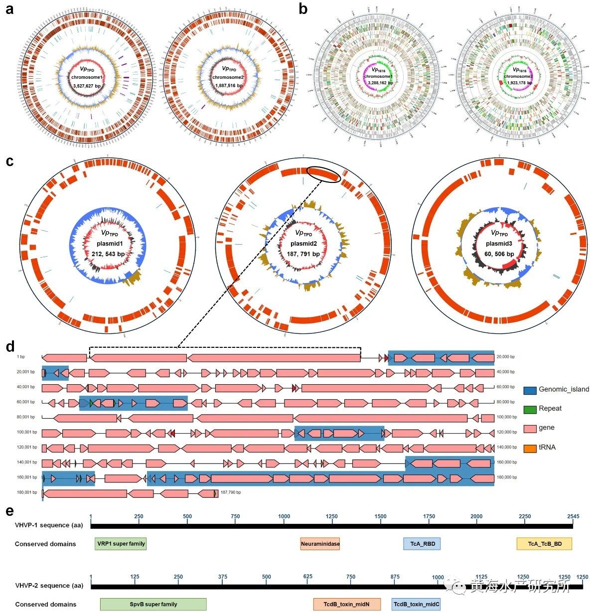 研究发现,TPV是由携带沙门氏菌毒性质粒毒力基因与杀虫蛋白毒力基因(双毒力基因)的弧菌(Vibriospp. causing TPV,VTPV)引起的细菌性疫病。TPV关键毒力因子VHVP-2由187 kb毒性质粒上的关键毒力基因vhvp-2编码,后者位于VTPV毒性质粒可移动元件上,具有在不同弧菌菌株间扩散的能力,VTPV因获得了关键毒力基因vhvp-2基因而对对虾仔虾具有了强毒力和高致死性。这是自2020年TPV大规模爆发流行以来,首次揭示其致病菌VTPV的高致死性致病机制。TPV多发生于对虾仔虾期P5~P7阶段,传播速度快,致死率高,发病2-3天仔虾死亡率超过90%。自2020年以来,TPV在沿海地区持续流行危害,给我国对虾养殖产业造成了重大经济损失。本研究是继该团队在TPV大规模爆发流行期间首次鉴定到玻璃苗致病菌(Zouet al., 2020)等工作之后,在VTPV致病机制研究方面取得的又一重要成果。