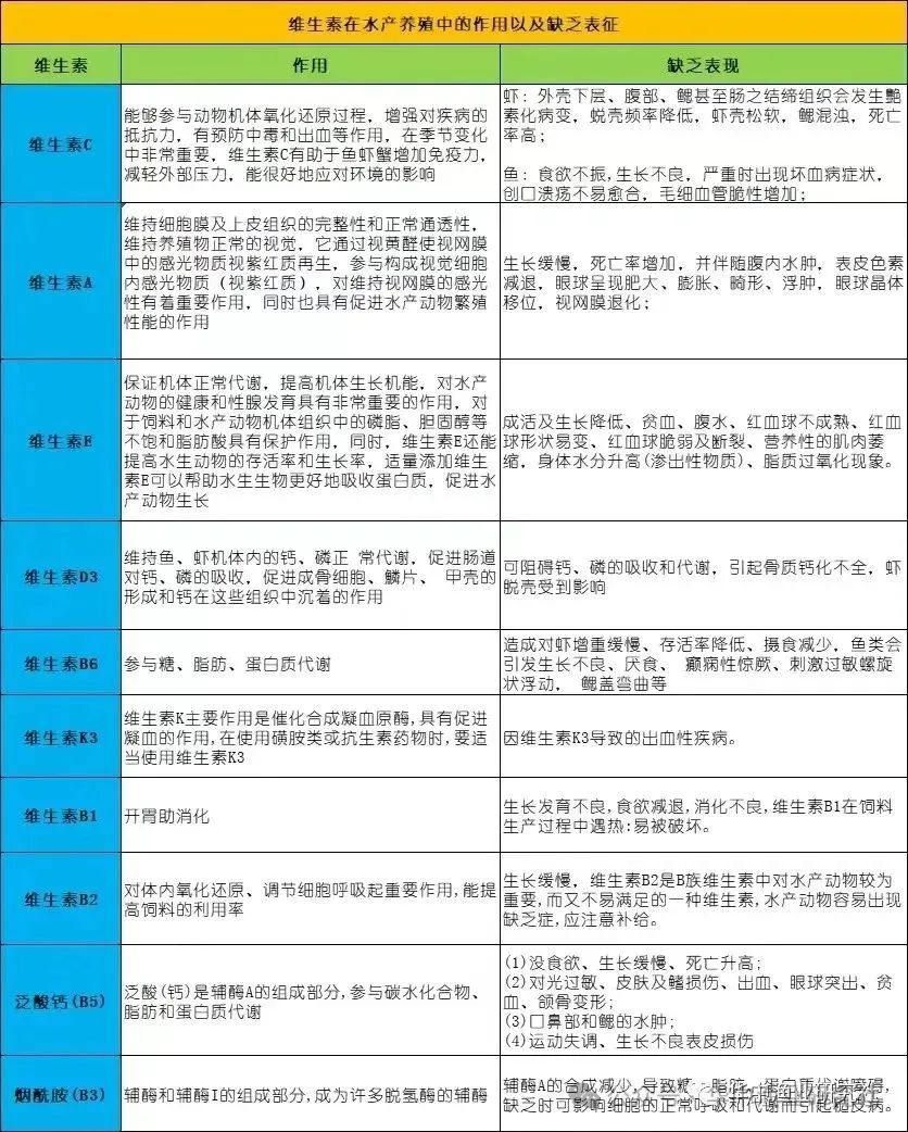 鱼类的肠道中微生物可合成某些维生素如生物素、维生素B12、维生素C、烟酸、泛酸和叶酸,但鱼类消化道较短,肠道微生物数量较少,从而使得鱼类肠道中微生物在提供维生素方面的作用很有限,维生素主要依赖饲料的供给。但由于不同的饲料品牌使用不同的饲料配方,而不同的水产动物对维生素的需求量也不尽相同。因此,需要大家根据养殖的水产动物进行维生素的额外补充。