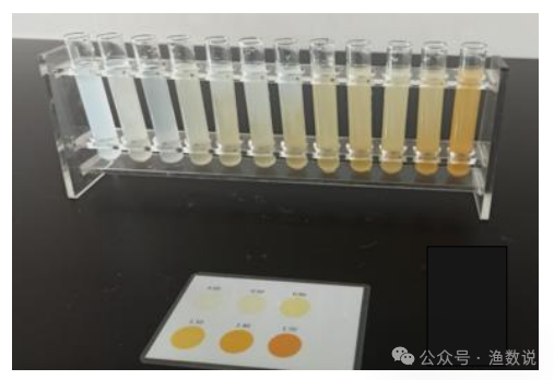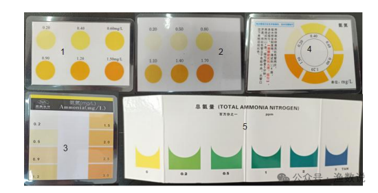 水质检测试剂盒以操作简单、方便快捷和成本低一直广泛应用于养殖一线,目前使用的主流水质检测试剂盒都有一定的局限性。根据实验测试分析主要在以下几个影响因素:比色卡量程和目视比色会对检测结果造成误判;温度对反应显色的速度具有一定影响,在水温较低时,使用水质检测试剂盒可能会导致检测结果偏低的误判;常见的氨氮试剂盒多采用纳氏试剂法设计氨氮比色卡,纳氏试剂法因掩蔽剂不足,不适合测试高钙镁的海水和咸淡水,测试池塘水样时部分试剂盒因产生白色浑浊导致无法正常比对比色卡读数。同时不同厂家比色卡有差异,存在调整背景色的可能性。
