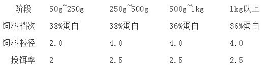 选择高档次斑点叉尾鮰膨化配合饲料,蛋白在36-38%,如此可以缩短斑点叉尾鮰的养殖周期,从而显著降低固定费用。投喂时速度一定要快,可以防止大鱼霸占食台,并且在用投饵机投喂的同时辅以人工撒料,让周围的小鱼也可吃到饲料,这样可以避免个体大小差异。分阶段投喂饲料如下表: